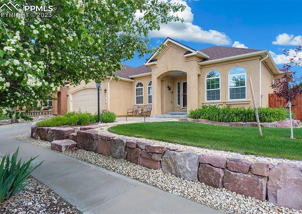 Highly desirable stucco rancher with fabulous curb appeal! Inviting covered entry, hardwood floors throughout the main level, fabulous great room designed floor plan perfect for flow and entertaining guests, formal dining room, cozy fireplace in the living room and central air conditioning for warm summer days. Main level living featuring a well appointed owners' suite with attached 5 piece bath and walk-in closet, second bedroom and convenient main level laundry. Perfect for entertaining: beautiful kitchen with lots of cabinet space, granite countertops, stainless steel appliances, breakfast bar and dining nook. Wired for a full house and outdoor sound system with built-in speakers and receiver included! Walk out leads to a private, fenced/walled back yard with gorgeous, colorful landscaping including lots of beautiful blooming perennials, shrubs & trees (including a beautiful apple tree). The fully finished lower level has a large family room, 3 additional bedrooms, full bath and office with French doors. LOTS of hardwood on the main and lower levels, with minimal carpeting. Corner lot in this popular neighborhood offers views of Pikes Peak and is near some of the newest restaurants, shops and entertainment venues Colorado Springs has to offer. Parks and schools are nearby, too. Come take a look today!