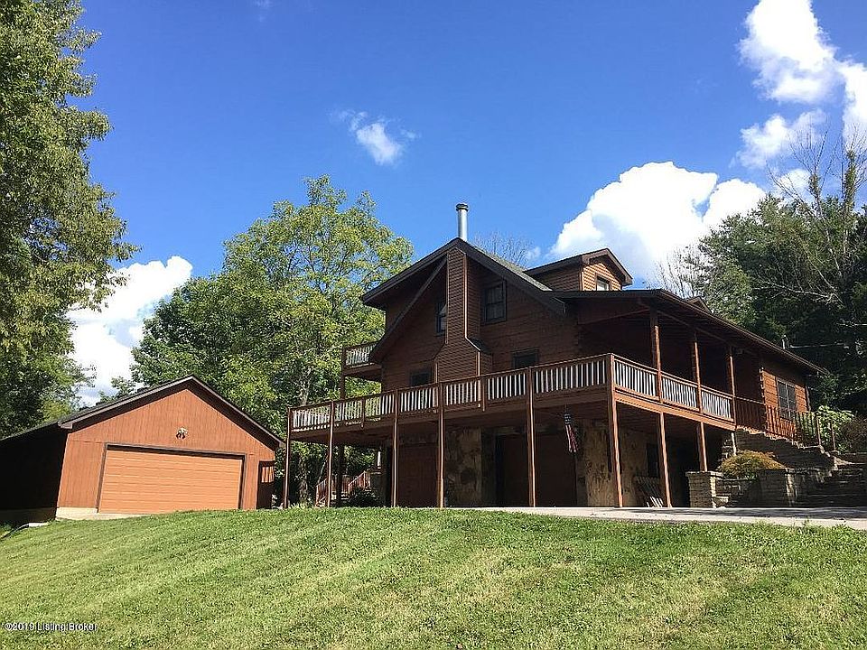 Professionally done patios, KOI POND, just under 5 ACRES, private cul-de-sac, tons of decking...this is outdoor living at its best AND a striking, OPEN PLAN log home! Previous owners had a lot of the property fenced in for their horses and there's a stall and run in shed on the back of the SECOND, detached 2 car garage. Pull up by the attached 2 car garage and you'll notice all the TERRACED PLANTING BEDS and steps up to the front door. Also notice that the deck wraps around THREE SIDES of the home for enjoying sunsets or sunrises. The logs were not darkly stained so the huge great room and dining area feel bright. The STONE FIREPLACE with raised hearth is the focal point of the room. Unique kitchen cabinets blend well with the log walls and there's plenty of counter space including a peninsula with BREAKFAST BAR. A large pantry completes the ample storage. The third bedroom and 4th full bath are on the main level along with a nice walk in laundry with it's own window and hanging area. Upstairs there's a STUNNING MASTER with a door to it's own deck overlooking the waterfall koi pond and the extensive property and trees behind. There's a big WALK IN CLOSET and extra storage as well as a master bath that's ready for your creative redo. Another huge bedroom with 2 closets and its own full bath complete the second floor. In the WALK OUT basement, there's a huge 2+ car garage, a rec/family room, full bath, kitchenette and small room for an office or storage. Walkout from the great room to the HUGE DECK that walks down to the STONE PATIO by the koi pond and planting beds. The detached garage has extra storage for hay or your sporting equipment. Walk through mature trees to a firepit spot, horse shoe pit or cross the bridge and small creek to wildflowers, more pasture and woods. All this charm and privacy and yet so close to great OLDHAM COUNTY SCHOOLS and shopping.
