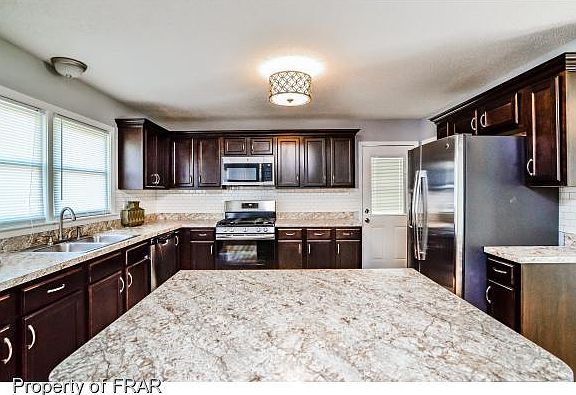 -Beautiful renovated brick home with 4 bedroom/2 full bath close to Ft Bragg in Ponderosa neighborhood.Refinished original hardwood floors in living area and all bedrooms.Living area with open concept to dining room and large kitchen.Kitchen has new cabinets with subway tiled backsplash,new countertops and island.Stainless Steel appliances including gas range.Master and Hall bath with large shower tub combo,new flooring,vanity.Insulated windows.New Roof and New Gas Furnance.Fenced backyard,shed.