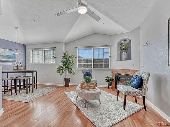 Immaculate and updated 1 bedroom condo in prime commuter location just minutes to DIA and easy access to downtown. Top floor end unit ensures peace and quiet and provides added privacy. This unit is light and bright with vaulted ceilings throughout, beautiful wood laminate flooring, and bonus mountain views out the front picture windows. The large open kitchen has newer stainless steel appliances, a built in pantry, and a breakfast bar over looking the adjacent living/dining areas. The inviting living room offers a corner fireplace feature and a charming art niche for added character. And, the spacious dining room is great for entertaining or could be a great home office space. The bedroom is very large and features sliding glass doors to a private balcony and a roomy walk in closet. Big full bath with dual sinks and separate laundry room with washer/ dryer included. Lots of storage and official use of 2 parking spaces. Wonderfully maintained, gated complex with lots of amenities including community pool, clubhouse, fitness center, and playground. The "Parking Spot" with public transport access located nearby. Would make a fantastic starter home (so quit throwing money away on rent!) or a great investment property!