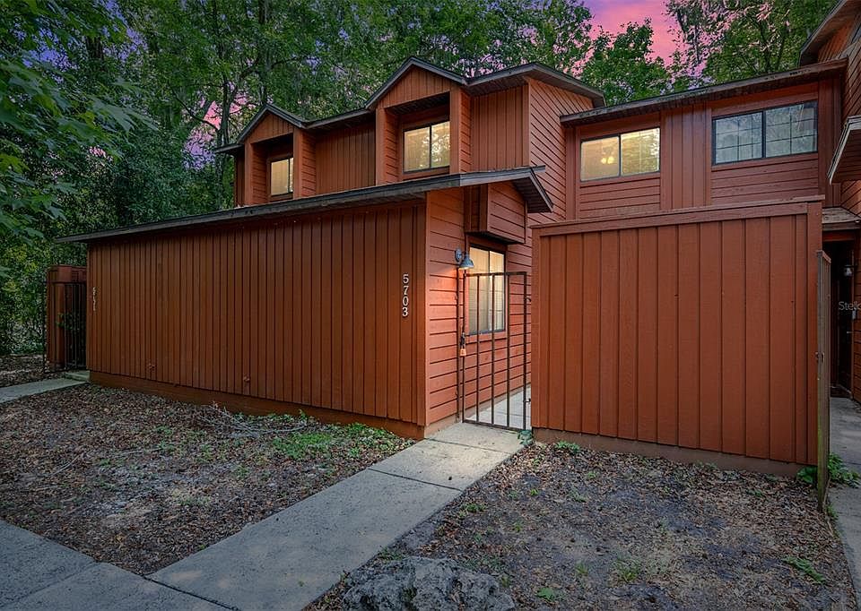 This affordable single family town home is in desirable location for students, professionals, and investors on the 20 and 21 direct bus line to the University of Florida. The Community is close to shopping, restaurants, I-75, Oaks Mall and UF. There are two community swimming pools, tennis and pickleball courts and volleyball court for onsite outdoor activities. The unit has a gated private entrance leading into the tiled front foyer. The bedrooms, stairs and living and dining room all boast laminate wood flooring while the bathrooms, kitchen laundry with 3 year old washer and dryer and enclosed porch, adding undocumented heated and cooled square footage, all boast tile flooring. The Living room has storage nook under the stair well and two story vaulted ceilings. The main bedroom upstairs overlooks the living room. There is a small space with a window that can be used as a large closet, 3rd room, office/den, workout space, etc. The kitchen cabinets, countertops and backsplash were updated around 5 years ago while the range and microwave were replaced in 2020. The HVAC was replaced in 2020 and the roof, even over the enclosed porch, was fully replaced in 2021. To top it all off, there is a paver lanai back porch that is great for morning cup of coffee or evening glass of wine.
