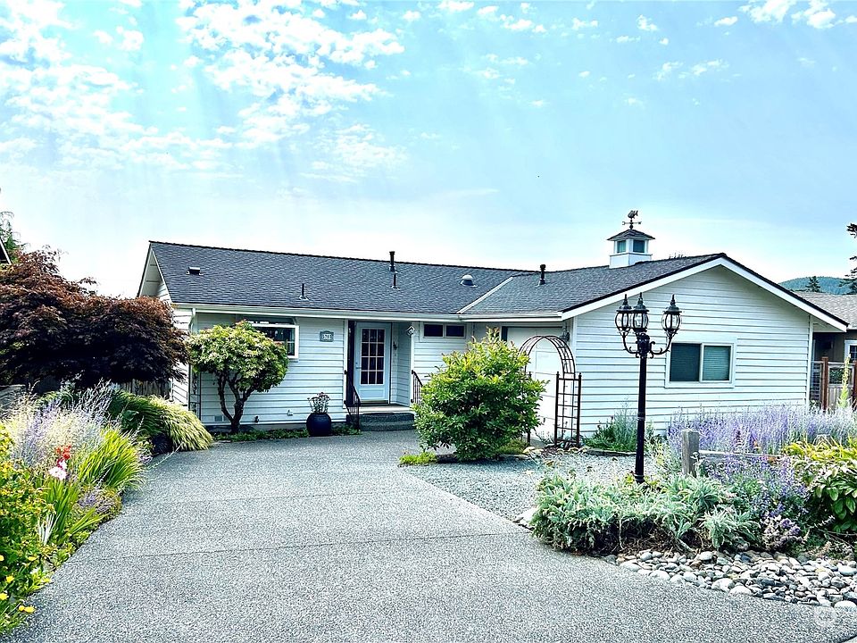 Gardener's paradise! Beautiful landscaping surrounds this charming 3 bedroom, 1 3/4 bath rambler in desirable Skyline neighborhood. Lots of natural light and great room feel. Open kitchen, dining area and living room with adjoining sunroom. Living room features a gas log fireplace and vaulted ceiling with a skylight. Sunroom opens to a spacious 2 level deck to enjoy the private, fully fenced gorgeous backyard and partial water view. Gas bbq hook-up on small patio. Even a fancy chicken coop! 1 car garage with good storage, workbench and EV plug in. RV parking with waste outlet in front graveled area. Close to Skyline amenities. Something for everyone!