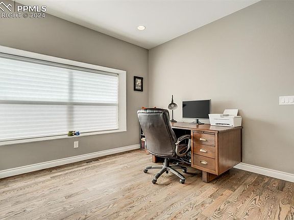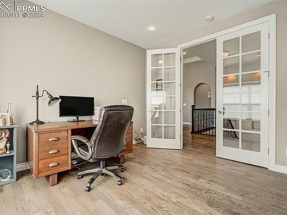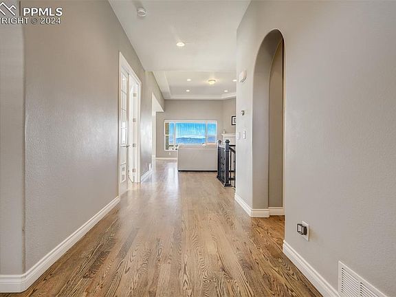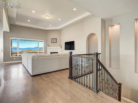 Breathtaking views from this stunning home in Wolf Ranch! This 5 bedroom home welcomes you with high ceilings, 8 foot doors, beautiful hardwood floors and an open, bright floorplan to enjoy to the magnificent view of Pikes Peak! Main level features a kitchen with stainless appliances, quartz countertops, a farm sink and a large counter bar open to the family room with 12 foot ceilings and a beautiful fireplace. A main level bedroom and bath as well as an additional bedroom that has french and is being used as a study. The primary suite is an oversized luxury retreat with the same Front Range views and an oversized spa like bathroom. Walkout from the great room and kitchen area to a covered deck centered on the mountains! The lower level is a fantastic large open space with 10 foot ceilings and a walkout to the covered patio area. There are an additional two bedrooms in the lower level as well as an area designated and roughed for a wet bar. Plenty of room for theater equipment, workout space and games! This is Colorado living at its best in a neighborhood that features plenty of walking trails, lakes, pool and D20 schools!