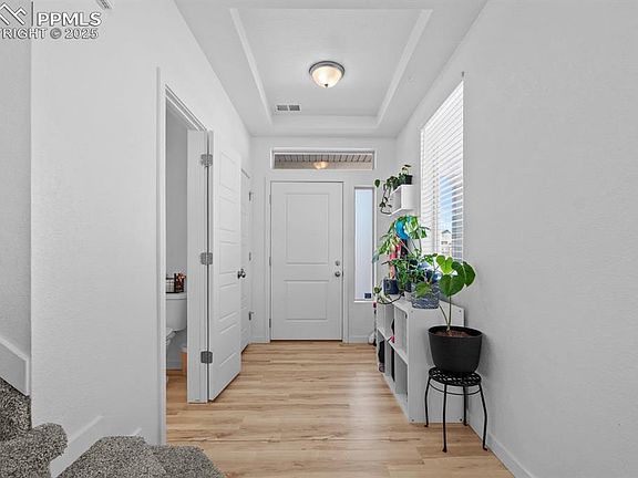 Welcome to this stunning three-story home in the sought-after Banning Lewis Ranch community. Perfectly situated on a corner lot, this home feels like new and offers low-maintenance living with a xeriscaped front yard and metro district-managed front yard landscaping. Step inside the first level, where beautiful LVP floors flow from the entryway into the spacious living room. Natural light pours in, highlighting recessed lighting + electric fireplace. The kitchen is both stylish and functional, featuring an island, gas stove, a decorative tile backsplash, and a pantry, along with a walkout and garage access. A convenient guest half-bathroom completes the main level. The second floor boasts two bright bedrooms and a full bathroom, along with a centrally located laundry room for ultimate convenience. The master suite serves as a peaceful retreat with a double vanity, large walk-in shower w/ double shower head, linen closet, and walk-in closet. On the third floor, a large open loft area offers endless possibilities—whether it’s a game room, home office, or entertainment hub. Step out onto the rooftop patio, a perfect spot to host gatherings or simply enjoy the serene Colorado evenings. The backyard continues to impress with a composite and wood deck, a landscaped yard with sprinklers, and a garden area equipped with drip irrigation. Living in Banning Lewis Ranch means access to exceptional community amenities, including a recreation center, water features, parks, and more. Plus, you’ll love the convenience of nearby shopping, entertainment, and schools. This incredible home offers the best of modern living in a vibrant community. Schedule your showing today and start imagining life here!