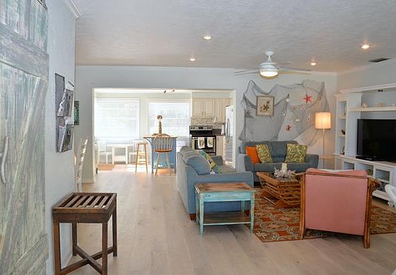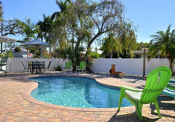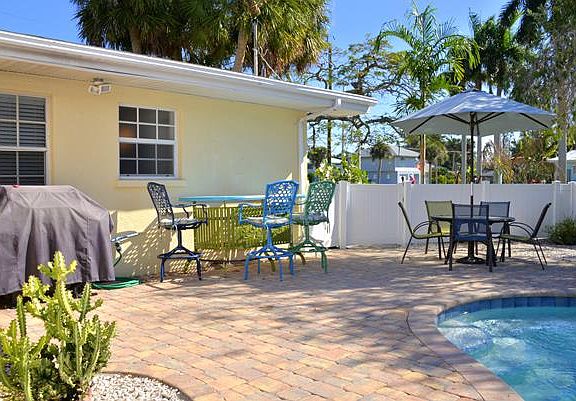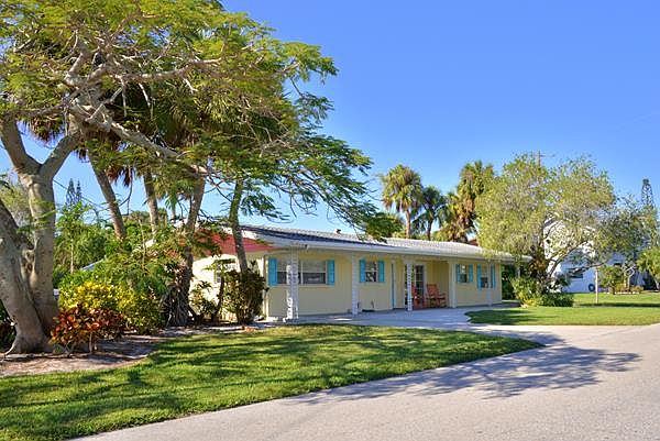 Island pool home located on large corner lot with 3 Bedroom plus Den; 2 Baths and ample space to entertain in its open-floorplan Kitchen, Dining Room and Living Room space. Lush landscaping features a mature Royale Poinciana Tree blooming with bright orange flowers in June. Also a huge stag horn fern and bottlebrush tree, sweet trellis, quaint gardens and decorative bridge adorns the yard. It's located in just a short walk to the beach.