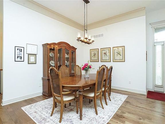 Upgraded home backs to treed greenspace. Lush landscape, stone/stucco front, stone walk welcomes you. Step into open living space w/11' ceilings, crown molding, formal dining, great room w/fireplace w/herringbone stone tile surround. Warm varied width wood floor at entry, thru all main level living areas. All new light & plumbing fixtures. Kitchen has bltin desk, extra drawers, pullouts in lower cabinets, solid surface counters, large island. Master suite updated bath w/granite dbl vanity, jetted tub, sep tile shwr