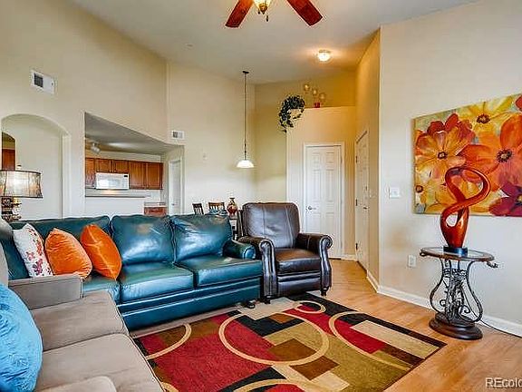 **PRICE REDUCED. WALK IN WITH INSTANT $10K EQUITY!!**Lovely 3rd floor unit with vaulted ceilings, hardwood floors and east facing morning sun. This clean and cozy home has an open floor plan well suited for intimate gatherings, and is ready for you to move in. This is one of the rare units with a large separate 11x4 storage room just outside the front door. Master bedroom features a walk-in closet and full master bath with oversized tub. Updated with brand new kitchen countertops and washer, newly painted throughout. Enjoy the hot tub, private pool, fitness center and open space in this charming gated community. Steps away is the 6.5 acre Singletree Park with off-leash dog area, basketball courts and playgrounds. Minutes to DIA- great for commuters and airline employees!