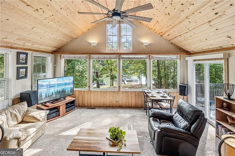 PURCHASE THIS HOME AS A TURN KEY! Incredible Opportunity to have your own Lake Lanier Getaway home w/ private boat dock. Beautifully redone with new roof, new windows, new driveway, new HVAC, fresh paint, LVP vinyl flooring, new bathrooms, and a gorgeous new kitchen with granite & top of the line appliances including a wine cooler, new cabinetry and tile backsplash. 1 bedroom house with large private primary suite on one side of the house and then a sleeping loft with king size bed for guests on the other side. WATER VIEWS GALORE from the moment you walk in the front door. Enjoy looking at your dock and boat while sitting in your living room. The tongue & groove ceilings bring out the charm of the living room area with expansive windows overlooking the water, which is only 40 yards away. There is a free-standing wood-burning fireplace in the living room w/ beautiful rock work making it a super cozy cabin feel in the wintertime. Master suite has a tray ceiling and huge new walk-in closet and a large sliding door overlooking the deck and lake. The laundry room is off the hallway and also serves as a storage closet after those trips to Costco. There is a large carport for your outside workshop or storage for your cars or lake toys. Lots of parking out front for guests or for storing boat trailers. The best part is the EASY 30 second walk to the water's edge and your private boat dock. Enjoy lunch atop the party deck or sit downstairs in the shade while watching the kids swim. 2 jet ski ports included. The sunset views from the dock are stunning and the water is ready to enjoy with 35 ft in the center of the cove and 15 feet below your boat's prop at full pool. This home is your affordable dream getaway. Owners are leaving all furniture and living essentials making it completely turnkey for you to immediately enjoy. The home comes with a propane firepit on the deck, a great hot tub, a grill and all the deck furniture as well as a firepit w/ chairs in the yard overlooking the water. The private covered single slip dock has a boat lift with electricity to the dock. There is a water pump on the dock that runs for use in watering the yard, cleaning your dock or filling live wells on your boat. Property is almost .5 acres leaving plenty of room for a new build like the neighbors next door or adding on to existing home. This home is just a 6-minute boat ride to Athens Boat Club to fill up or a 25 min boat ride to Pelican Pete's for dinner. 5 mins off Ga400 and only a short 25 mins to Dahlonega to enjoy the wineries. It truly is the best of both world's...a wintery cabin escape with all the FUN lake living has to offer!