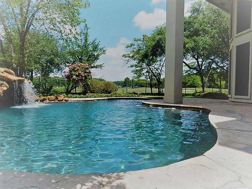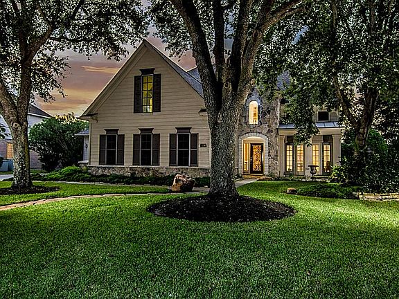 NO FLOODING... even during Harvey! Listed well below appraised value. Backyard Tropical Oasis overlooking 14th fairway/hole at WindRose Golf Course! Heated pool w/waterfall, slide, cave, spa and lush landscaping! Master suite down, New tile and updates in Master Bath! 2nd bedroom and full bath down! Game Room, Media Room and 3 Bedrooms are up. Spacious living room has soaring ceilings and open to Kitchen and Brkfst area. New roof installed Aug 2016. Repainted throughout house.