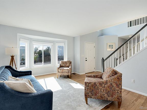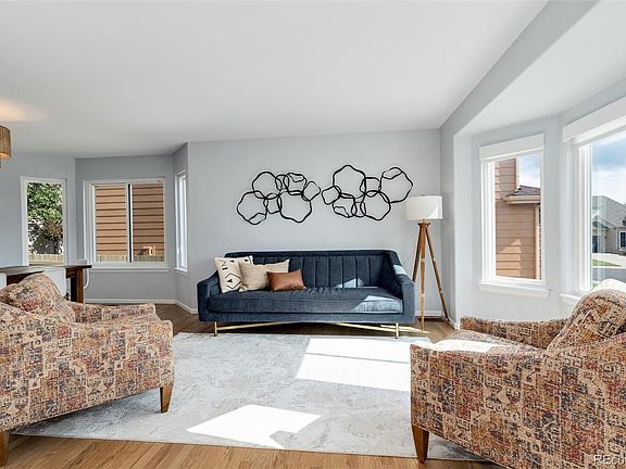 Gorgeous two story with main level bedroom and bath! Cherry Creek schools with backyard gate access to walking path leading to neighborhood elementary school! Enjoy outdoor living with custom stamped concrete front patio combined with low maintenance backyard perfect for entertaining and daily living alike! Extensive wood floors and high grade carpet! Main level offers an excellent flow with open living and dining rooms. Upgraded kitchen boasts white cabinets, quartz countertops, subway tile backsplash, island, stainless appliances and appealing seating options! Spacious family room with gas fireplace and high ceilings is open to the kitchen and provides access to the sweet backyard! Upper level offers a large primary suite with mountain views, vaulted ceilings, walk in closet and five piece bath! Across from the upper level primary suite are two additional bedrooms and a full bath. Open and light filled with newer windows, central air conditioning, newer driveway, main level laundry and a welcome feel throughout! Bonus of partially finished basement with room for future finish. Fantastic opportunity!