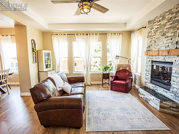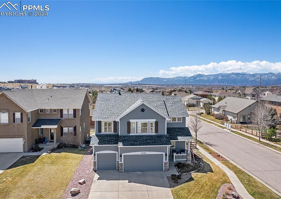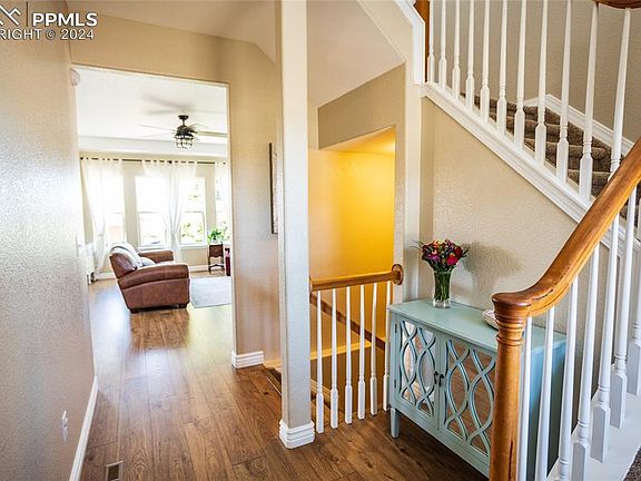Corner lot on a cul-de-sac in Wolf Ranch with tasteful updates! The living room is highlighted by the gas fireplace, built-ins, and gorgeous mountain views. Large and open kitchen includes an island, stainless steel appliances, eat-in area, corner nook for a work space, and pantry. Right off of the garage is a charming drop zone with a bench. Also on the main level is the laundry room and half bath. Upstairs, the primary bedroom features vaulted ceilings, a newly updated bathroom with a roomy tub and a walk-in closet. There are also three nice-sized bedrooms and a full bathroom. The cozy finished basement has Pergo laminate flooring, lots of natural light, a spacious bedroom, and full bath. Outside, the beautifully landscaped backyard provides a great space to enjoy the Colorado evenings with a deck, patio, and built-in fire feature! Recent updates include new roof with class 3 shingles (12/23), new exterior paint and garage doors (3/24), and new furnace and AC (10/22). Located by ample shopping, parks, schools, and Powers Blvd - this home is a real must see!