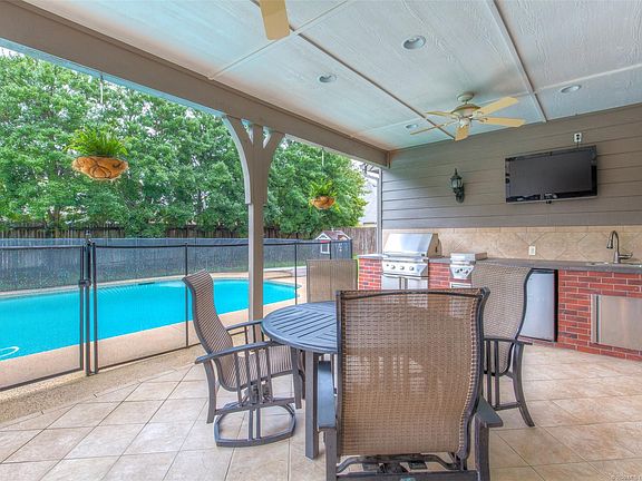 Stunning home w/COVETED, flexible floor plan & loads of custom details on quiet cul-de-sac lot; JENKS SE Elementary! Large living w/wood floors, soaring beamed ceilings & FP opens to spacious kitchen w/tons of storage, granite, SS apps & sunny dining area - perfect for entertaining! Master suite w/awesome closet + 2 beds/pullman bath DOWN! Private study w/French doors. Enormous bonus room + bed/full bath up. Extensive covered patio w/fully equipped OUTDOOR KITCHEN looks to private yard w/gorgeous pool!