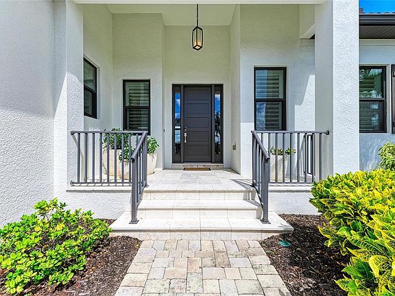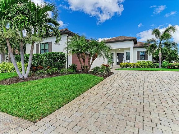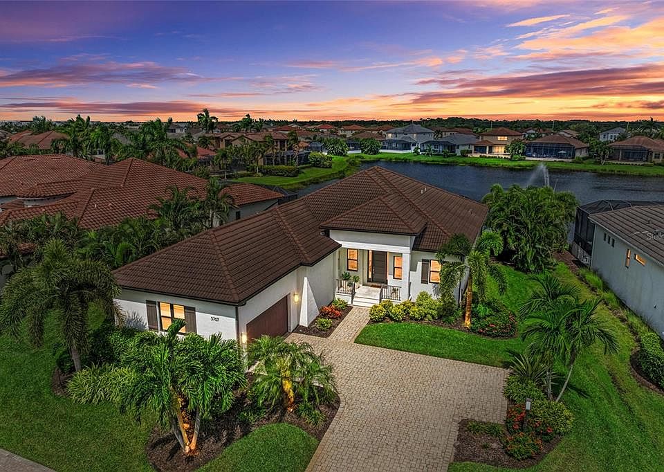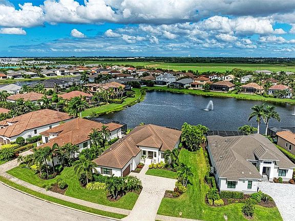 Exceptional custom home in the beautiful, gated enclave of Legends Bay. This home is immaculately maintained and offers remarkable construction quality, sophisticated design, and outstanding functionality. A prime water view location provides a serene backdrop to daily life. Lush tropical landscaping, a paver driveway, and a timeless exterior welcome you home. Built by a highly respected custom home builder, with meticulous attention to detail, you'll enjoy open sight lines, elegant designer features, symmetrical architecture, and abundant natural light. This 3-bedroom plus den home offers open space for gathering and split bedrooms for privacy. Soaring 12' ceilings and tall impact stacked sliding glass doors and transom windows contribute to an airy ambiance. Seamless indoor and outdoor living spaces showcase tranquil lake and fountain views. Special features include enhanced landscaping, designer lighting, timeless wall treatments, exquisite stone flooring and counters, crown molding, solid-core doors, plantation shutters, and state-of the-art appliances. The stunning showcase kitchen is a chef's dream with a natural gas Wolf range, tall wine refrigerator, double ovens, and quality dovetail soft close wood cabinets. The gleaming quartz countertops and large island are ideal for entertaining and everyday convenience. The well-appointed owner's retreat offers peaceful views, a walk-in shower, and expansive custom closet cabinetry for organization. Two guest bedrooms share a "Jack and Jill bath" on a private wing. The flexible den space is ready for remote work or extra space for relaxation. The fabulous outdoor living is an oasis that blends seamlessly with the indoor living area. Luxurious travertine and an extended screened in lanai surround the heated pool. The panoramic screen frames beautiful year-round views. The pool bath is accessible from the lanai for added convenience. Residents appreciate Legends Bay’s welcoming atmosphere and charming tree-lined streets. Amenities include a lakeside pool, clubhouse, walking path to the pier, and social activities. The association fee covers yard maintenance and cable/internet for ease of living. Quick access to IMG Golf & Country Club and IMG Academy (golf-cart accessible), and just minutes from Anna Maria Island and Longboat Key. This energy-efficient and elevated home was quality built for the utmost peace of mind and reasonable insurance. Legends Bay’s vibrant community and amenities make it easy to settle in and enjoy the Florida lifestyle. Experience the joy of living close enough to the bay that you can feel the coastal breeze yet sheltered away enough to avoid the stress of storms. This home was built with exceptional construction quality for very discerning clients. Come see if this incredible home is the opportunity for you. Virtual tours by drone and 3D Matterport available.