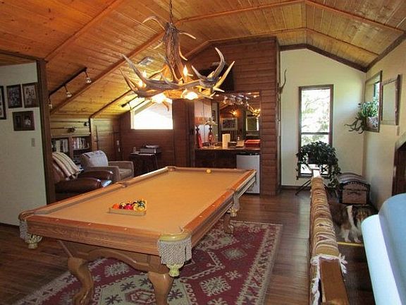 BEAUTIFUL PRISTINE CUSTOME HOME. NESTLED AMONG THE PINES AND TREES. LOADS OF WOOD ON THE INTERIOR TO GIVE THAT GREAT CABIN FEEL. SPACIOUS MASTER ON MAIN LEVEL OR MASTER UP STAIRS. LOFT AREA HAS WET BAR,POOL TABLE, LOTS OF SEATING, AND A BEDROOM AND BATH. 4 SEPERATE DECKS,ANTLER CHANDELIERS, HUGE COVERED BACK DECK, LOADS OF PARKING AND SUPER LARGE WORK SHOP.PAVED ROADS AND UNDERGROUND UTILITIES. BEAUTIFULLY LANDSCAPED AND THE HOME IS IN PERFECT MOVE IN CONDITION.2 FLAT SCREEN T.V.S,ANTLER CHADELIER, AND POOL TABLE TO BE INCLUED IN SALE AT NO EXTRA COST TO BUYERS.