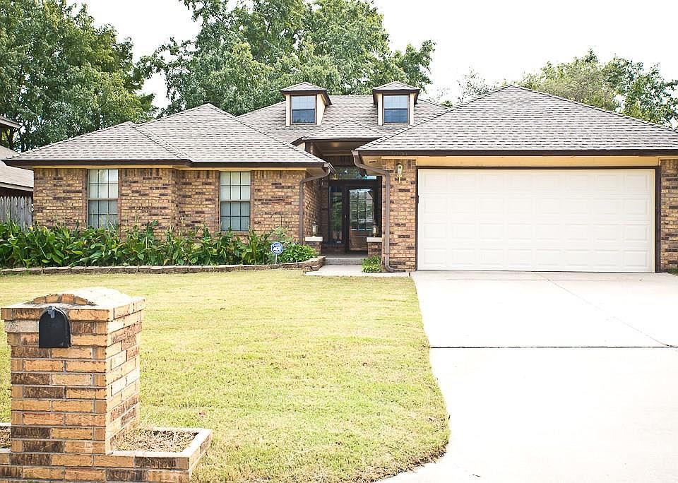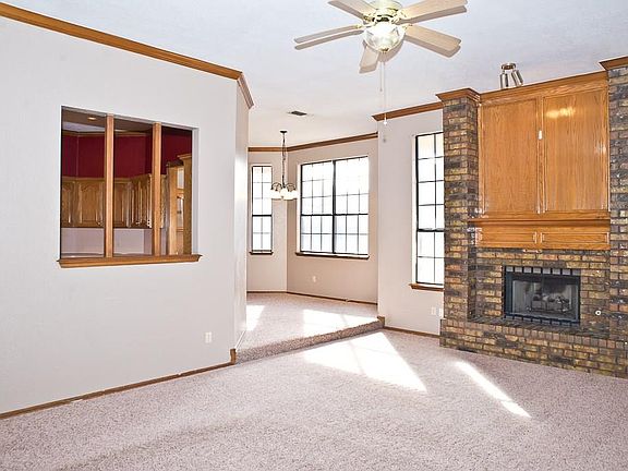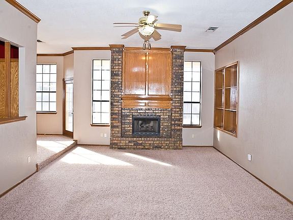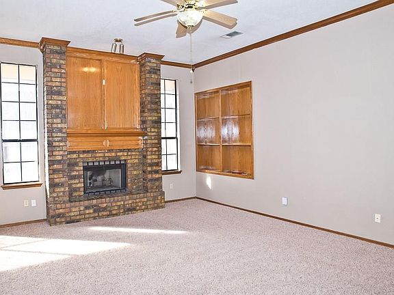 Home opens into a large living area with brick fireplace adorned with wood mantle, crown molding and built-in shelves. One dining area has a built-in china cabinet space as well with lots of storage. The kitchen has ample cabinet space, island, built-in breakfast table and bench seating, two pantries on each side of the table and gas stove. The master has a vaulted ceiling and master bathroom has separate shower and garden tub, double vanities and his & hers closets. Other features of this home include: water softener, full wood fencing and storage shed. Home has been professionally cleaned, including carpets in Feb 2019.