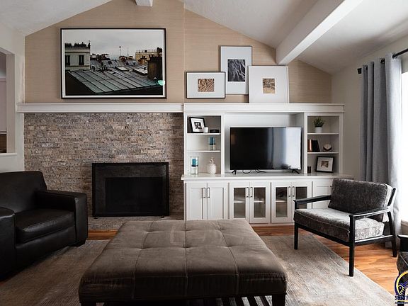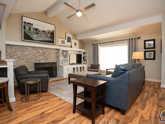 What a find! This move-in ready maintenance free ($165/month) Ranch style home in Washburn Rural Schools! Designer decor, open floor plan with huge vaulted living room + fireplace, large dining, wonderful kitchen with stainless appliances (gas stove, refrigerator, dishwasher), breakfast bar, and 3 bedrooms on the main floor plus 2 full baths! Primary bedroom has private bath and large closet. Finished basement with built-ins and 1/2 bath. Amazing private backyard totally landscaped with privacy fence. Be sure to tour this lovely home!!!
