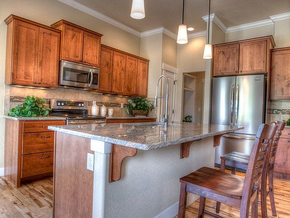 5-CAR GARAGE!! Dazzling 2,000 sq ft ranch, 3 bdrm + study, spacious open floor plan, high level of standard finishes, 10' ceiling on main level & 9' in basement, large covered back patio overlooking green belt. Did we mention a 5-car garage?! Granite kitchen counters, large pantry, eng hardwood & tile flooring, A/C, fireplace, ceiling fans, high efficiency furnace & water heater. Master suite w/ walk-in closet w/ laundry pass-thru. Might be the PERFECT HOME! Pics of Corbel plan w/ some upgrades.