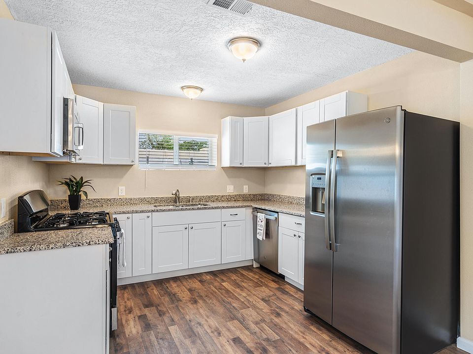 Fully renovated 3 bedroom home, with 2 full bathrooms. Beautiful granite counter tops in kitchen. Wood laminate flooring throughout, carpet in bedrooms. Private exterior with wall around, and gate! Backyard access! Refrigerated A/C!