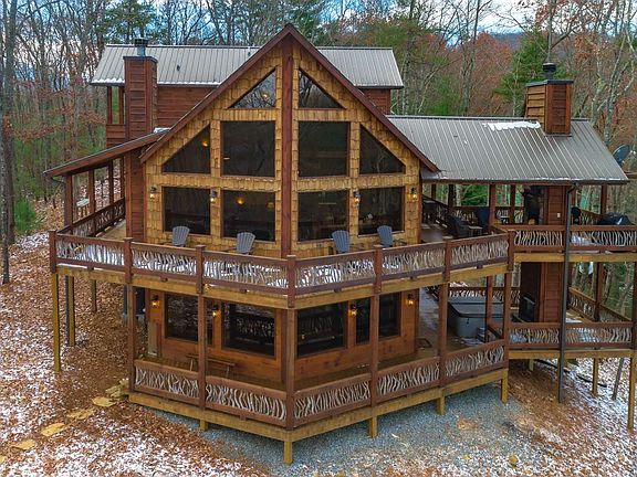 Perfectly Perched at the Highest Point, Overlooking a SEA of "National Forest" Mtn. Peaks discover this Masterpiece of Design in an Outstanding Aska location.Thoughtfully Planned w/Unparalleled Quality & Exceptional Rental History.Long LEVEL Driveway Approach affords Privacy & leads to an Inviting Exterior of Cedar Shakes, Live Edge & Log Siding wrapped w/Laurel Branch Railings.TWO "Extended" Party Porches (16X24)w/REAL Stone Fireplaces. Generous Great Rm w/WALL of (10)Windows illuminating Rich Wood Textures & Contrasting Stains. Handsome Stone Fireplace, Wainscoting & Open "Slab" Staircase. Kitchen features Raised "Wood" Bar, Granite Tops, Hammered Copper & Wrought Iron (Gas Stove). Extended Main Level Master Suite w/Sitting Area,Soaking Tub, Enormous "Slate" Shower (Transom Window & Frameless Shower Doors) & Double Granite Vanity. Open Loft "Office" Area, (2) Guest Rms (one w/Private Porch) w/Fixed Gable Glass & Full Bath w/Tile Shower & Extended Granite Vanity.