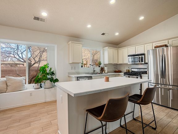 A Must See 3-bedroom 2 bath 3 car open floor plan home. A warm spacious remodeled kitchen that opens into the main living area, perfect for entertaining or cozying up on the couch next to the fireplace. New countertops, Stainless steel appliances, extra cabinet /counter space perfect for a coffee/tea bar and oversized island that is the centerpiece of the kitchen. New flooring throughout with new fixtures, lighting, and fresh paint. The Owner's Suite, complete w/separate shower, tub, Walk-in Closet, Full Bath, double sinks upgraded fixtures and much more Can't forget the formal dining room that could be an office or a possible 4th bedroom located on oversized almost 1/4 acre lot w/refrigerated air. Easy access to shopping, Kirtland AFB, downtown and the movies...plus a quick walk to the park
