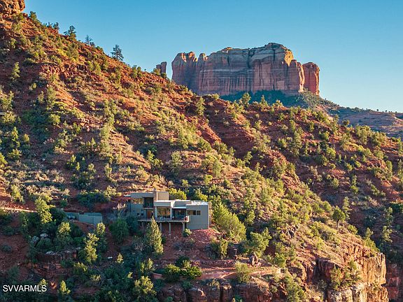 This Contemporary home is on 2.42 acres at the end of a private road on a bluff with creek frontage overlooking miles of Sycamores that turn spring green and fall gold. The Great Room has cherry wood floors with an open floor plan, two story ceilings and a beautiful stone fireplace. Three on suite bedrooms with amazing views make for a comfortable living arrangement. The master has a large walk in closet and the master bath has a copper lined tub that is outstanding. The two story great room windows face North for all day sun kissed red rock views.