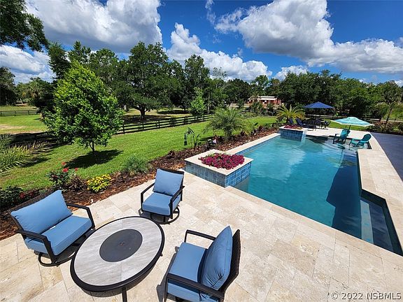 Needle in a haystack! This CUSTOM built 4-or 5-bedroom upgraded luxury home overlooks more than 3.5-ACRES of A-1-zoned land right in the heart of Longwood. Fenced and cross-fenced. Bring horses, boats, RVs - there's space for all of them and NO HOA. Built in 2020 for efficiency, comfort and privacy. Spray foam insulation, dual A/C systems, hybrid water heater and upgraded windows help keep energy costs low. Enter the front doors and you'll be pleasantly surprised by the attention to detail from the 12' volume ceilings including seven tray ceilings all the way down to the luxury vinyl and tile flooring. Crown molding in all rooms, luxury LED lighting and 10' tall triple pocket doors open up to a travertine lanai and pool deck with motorized screens. Saltwater pool has advanced water and lighting features along with a sun shelf and outdoor shower. Gourmet kitchen has 9'x'6 quartzite island great for all entertaining needs. Cooktop, double convection ovens, dishwasher and microwave are all Monogram complimented by an LG ThinQ refrigerator. Two walk-in pantries! Wood-burning fireplace is also plumbed for gas conversion. Master suite has big windows and motorized blinds for privacy. Master closet features built-in shelving and an electronic dog door. En suite bathroom is loaded with 2 vanities, luxury tub with built in heat, airbath, whirlpool, aromatherapy and mood lighting. And, the walk-in shower has 8 shower heads including a rainshower! Triple split floor plan includes dining room, office/5th bedroom, breakfast nook and 2 more bedrooms and baths. The theater room wired for a projector. The 3-car garage is 25'x37' and detached barn/metal building is 30'x45' with two roll-up 10'x10' doors. Two healthy pastures and a wood area currently used for chickens (fresh eggs!) along with the main yard all fenced with running water. Trees include lemon, lime, orange, tangerine, grapefruit, banana and peach. Vegetable garden and a butterfly garden are icing on the cake!