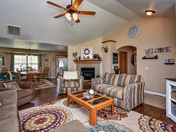 Beautiful and spacious single level home with split bedrooms on cul-de-sac in Carriage Crossing. Beautiful gazebo and patio area, wired for hot tub, plus a firepit area and a storage building. The back yard is completely privacy fenced with drive through gates. You will love the high vaulted and tray ceilings. The gas fireplace and the arched openings add a lot of character to the living area. Big windows give plenty of natural light and there is abundant cabinet & counter space. The dining room is large enough to seat 8 comfortably. Very large master with additional sitting area. The beautiful engineered hardwood floors were just installed in 2018, and the roof was installed in 2016. There are 2'' wood blinds throughout the home. Very quiet neighborhood with wonderful neighbors.