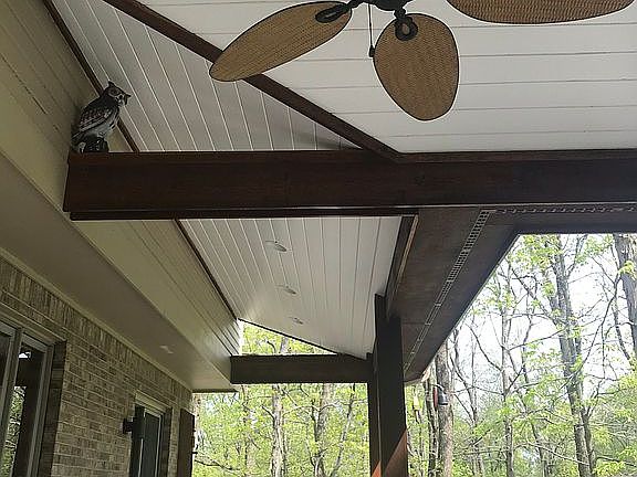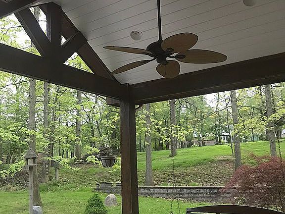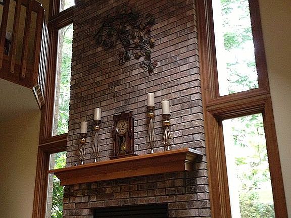 Contemporary home on a private one acre lot with mature trees and park like back yard. The living room has a 27 foot ceiling with a full wall fireplace.
