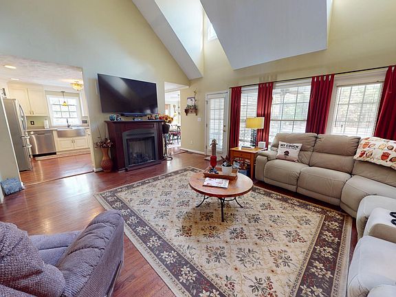 Elegant details are found throughout, including rich hardwood floors, a soaring vaulted ceiling in the living room, and crown molding in both the kitchen and dining room. The kitchen offers ample countertop space, bar seating, a farmhouse sink, and a generous dine-in area perfect for hosting large gatherings.