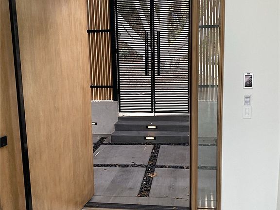 The entry welcomes you with a custom-built pivot door and floor-to-ceiling glass bi-fold doors that flood the home with natural light and create an effortless transition to the outdoor spaces with breathtaking views. The gourmet kitchen is equipped with marble countertops, state-of-the-art smart appliances, custom cabinetry, and an elegant waterfall marble island. This level also includes a versatile bedroom or office, featuring a privacy switch-light glass bathroom and a custom concrete trough sink.