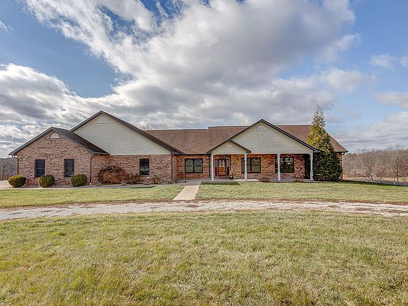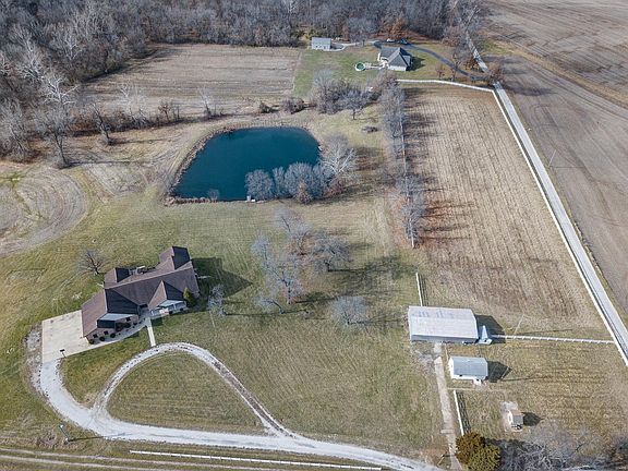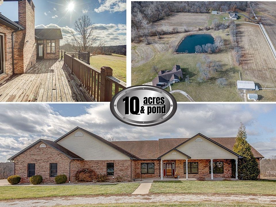 7 minutes from Waterloo, on 10 private acres, sits a sprawling brick ranch that is ready for entertaining. The 6,433 sq ft home with partially finished walkout basement has so much space to make use of. All 4 main level bedrooms have walk-in closets - including 2 master suites with very large walk-in closets. The spacious eat-in kitchen has a large island, plenty of cabinetry plus a 6 x 6 walk-in Pantry. Excellent views of the lake & woods can be seen from the kitchen or even better from the sunroom which would be the perfect place to start the day with a cup of coffee. On the main level, a large living room with a wood burning fireplace & wet bar, plus a formal dining room & a den with a large foyer with hardwood floors. The partially finished walkout basement has a large family room with wood burning fireplace, a full bathroom plus more rooms & storage space. 3 car attached garage. Outbuildings & a white vinyl fenced pasture with plenty of room for animals completes the setting.
