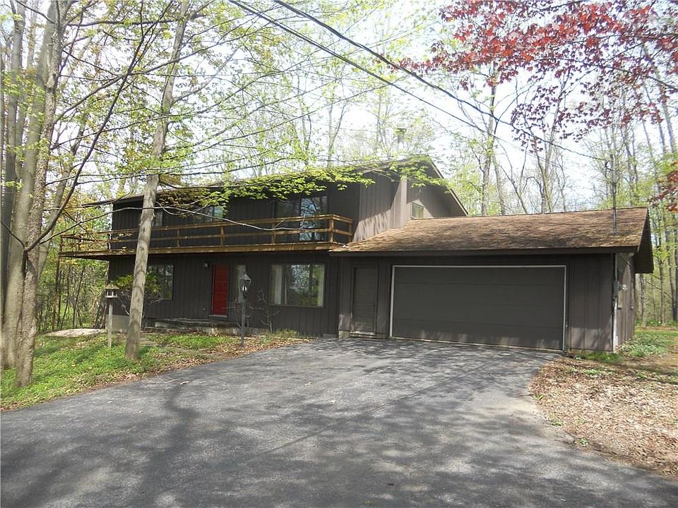 There's amazing space in this 5 bedroom, 2.5 bath home! Large living room with wood burning fireplace, dining room with sliding glass doors to deck, eat-in kitchen with quartz counter tops, den, 1st floor laundry, master bedroom bath, upper deck off master bedroom, finished basement and never ending closet and storage space. All this and more on just over 8 acres!