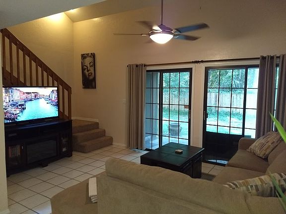 Unit will be available for showing after May 4th, 2018... Private courtyard entry, large living/dining area with tile flooring, newer kitchen appliances. Bedroom and full bath downstairs. Large master bedroom upstairs with glassed view of downstairs and attached study perfect for computer, library or nursery and full bath. Utility room with washer and dryer. Relax afterhours on the rear lanai. Or meet your friends at the community pool, clubhouse, or on the volleyball and tennis courts. Bus stops right in front of the complex. Close to Oaks Mall and North Florida Regional Medical Center and an easy commute to UF and Santa Fe Community College. Viewing by appointment only.