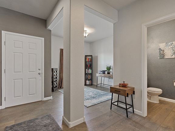Southern exposure, Solar Panels(owned!) Wood flooring throughout main level. Gorgeous kitchen with Slab Granite Counters, island, Decorative Tile splash back. All appliances stay, including GAS stove.42 inch Cabs with crown molding and handles. Walk in Pantry, upgraded light fixtures. Backyard features huge patio, with concrete walkway on both sides, water feature, garden beds with drip system, Mountain Views, Backs to open space! Upstairs Laundry, HUGE master closet, 5 pc bath, 3 additional bedrooms, with full bath and double vanities! Crawl space is same size as main level (approx 4 ft high) for added storage. Shelves in garage will stay or go, depending on buyers wishes. Garage is fully dry walled. Backyard has Beautiful flowering plants (will bloom once weather permits) Hand sanitizer will be provided upon entry and exiting of the home. New Roof!