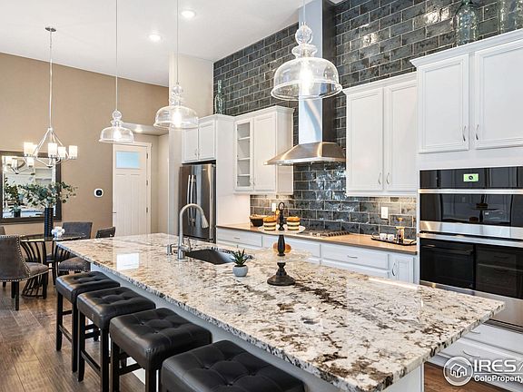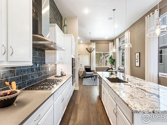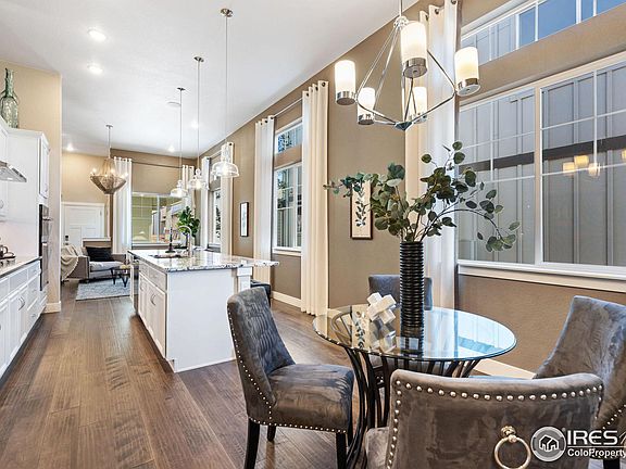 Nestled in Trailside at Harmony and close to popular bike paths and walkable conveniences, this stunning former model home with luxury features is sure to please. Enjoy engineered hardwood floors and soaring 12-foot ceilings on the main level along with a private study. The chef's deluxe kitchen is a culinary dream, complete with a gas cooktop, vent hood, and a massive island perfect for entertaining. Cozy up by the gas fireplace in the spacious living area or step outside to the covered patio, ideal for outdoor gatherings. The beautifully landscaped, low-maintenance yard offers serene beauty without hassle. This home also boasts an oversized, finished, and insulated 2-car garage. All bathrooms are adorned with floor-to-ceiling tile in the tub and shower areas, adding a touch of elegance. Don't miss the opportunity to own this meticulously designed home with all of the bells and whistles along with park, pool, and splash pad just steps away!