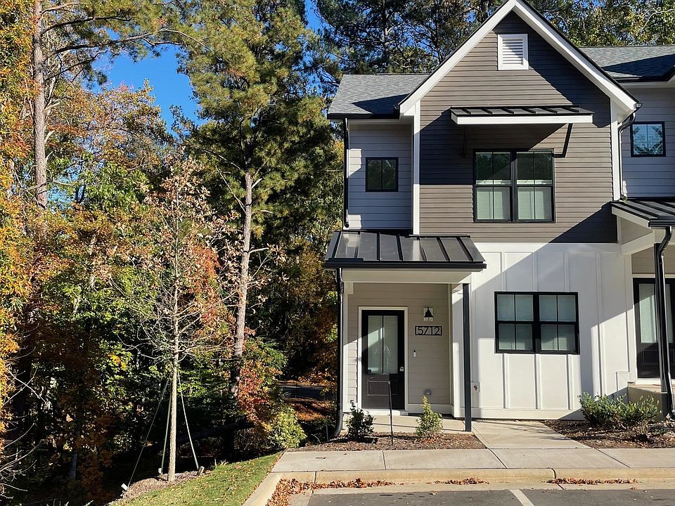 Brand new end unit townhome in new subdivision with great location near North Hills!  Still under builder's warranty. Beautiful kitchen with quartz countertops and top end appliances - start your oven with your cell phone! Open floor plan with clean lines and natural light.  Private deck facing wooded area and creek; three bedrooms - you can control the ceiling fans with your cell phone! Two bedrooms with en-suite bathrooms on separate floors.  A true gem!