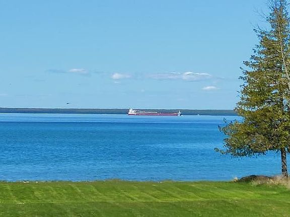 This recently restored Northern Michigan log and stone home, seamlessly blends modern conveniences with rustic charm. Step inside to find a grand foyer that uniquely showcases the exterior of the original cabin. The soaring ceiling and wall of windows looking out over the Straits of Mackinac is sure to impress. This heated/insulated room also features a spiral staircase leading to a cozy shipwatch loft, complete with an LED fireplace - the perfect place to curl up with a book and watch passing freighters or catch the Northern Lights.