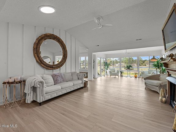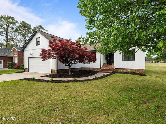 Nestled in a serene, nature-filled environment, this beautifully maintained home overlooks a peaceful pond, offering the perfect escape. The open-concept layout invites you to gather with family and friends in a spacious living area with vaulted ceilings and a cozy gas log fireplace. Recent updates, including new windows, recessed lighting, and high-quality LVP flooring, create a modern and inviting atmosphere. The extended living room area is a true retreat, with expansive views of the lush backyard. The kitchen has sleek white granite counters, stainless steel appliances, and a charming breakfast nook that makes mealtime a pleasure. The split bedroom floorplan offers privacy and comfort, while the master suite impresses with its spacious layout, board and batten feature wall, and a luxurious spa-like bathroom. Two additional guest rooms provide ample space for family or visitors. Enjoy the convenience of all living on one level, with all appliances and the framed TV over the fireplace to convey. An unfinished space above the garage is wired and ready for expansion. Plus, the home is equipped with a generator plug for added peace of mind. Some furnishings may be available for separate purchase. Located in a premier, resort-style, gated coastal community, this home offers incredible amenities, including an 18-hole golf course, The Pointe restaurant, two marinas, tennis and pickleball courts, a community center, dog park, boat ramp, kayak launch, walking trails, picnic pavilion, and playground. All this and just minutes from historic downtown New Bern's shopping and dining, and a short drive to the beach. This is coastal living at its finest!