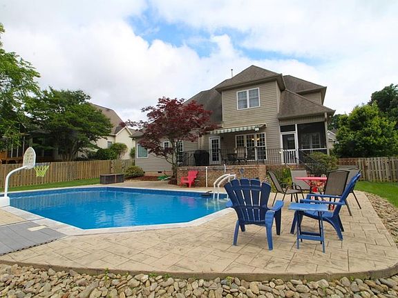 GREENSBORO Fleming Meadows 4Br 2.5Ba plus Office! Inviting home with lots of natural light, deep moldings, columns and a 2nd level catwalk. Living room with vaulted ceiling, recessed lighting & electric wall fireplace. Kitchen features granite countertops, tile backsplash, stainless steel appliances & oven/range with air fryer. Main level primary suite has 10 x 10 sitting area. Central vac. Dual A/C. Well-landscaped lot overlooks pond. Great outdoor entertaining spaces include screened porch, patio with retractable awning, fenced backyard and large pool! Convenient location near shopping, restaurants, trail to Centennial Park & major roadways.