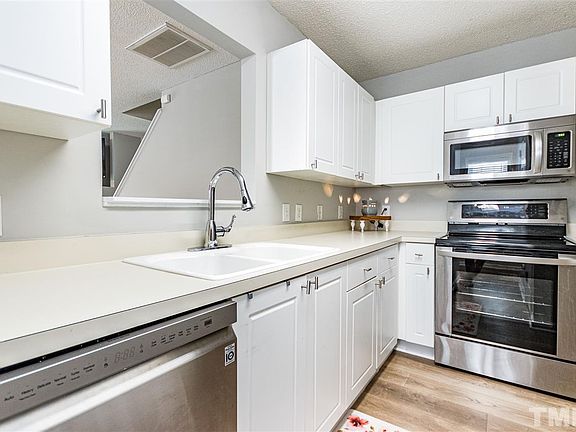 Serene END UNIT townhouse on the Greenway! Single car garage, newly screened in porch looking out at beautiful large yard and walking trail, brand new SS appliances 2020, new paint 2020, new carpet and flooring 2019. Open floor plan with abundant light, built-in shelving, full baths in both bedrooms. Enjoy all that Hedingham has to offer including golf, pools, gym, tennis, playgrounds, clubhouse, and trails! Super convenient to shopping, restaurants, and all of Raleigh, WELCOME HOME!