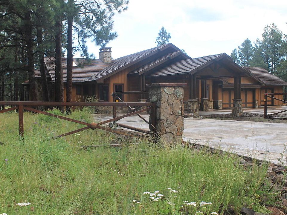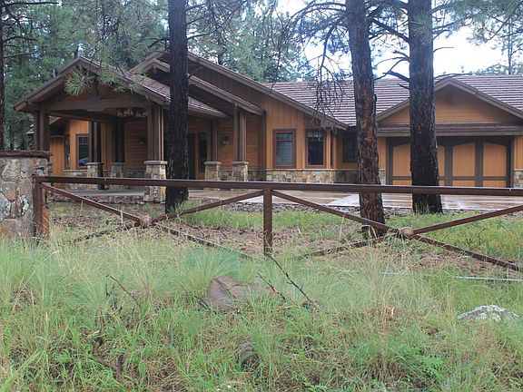 FEATURED ON HGTV's Luxury Mountain Living!! Gorgeous, single level, custom home on over two and a half acres with peak views. Quality is abundant with features like...vaulted tongue & groove ceilings, telluride stone fireplace, slab granite counters throughout, SS appliances, double ovens, custom cabinetry, 8' solid knotty alder doors, wood and porcelain tile flooring, central vac, and more. Expansive Trex deck w/ wood framed double pane windows merges the inside with the outdoor surrounding beauty northern AZ has to offer. All of this in an amazing split floorplan with office and bonus room. More extras......AC, Surround sound and separate jacuzzi room elevate the amenities of this home. The stunning porte-cochere entrance adds to the quality and stature of this home. A must see!