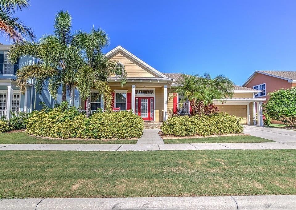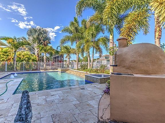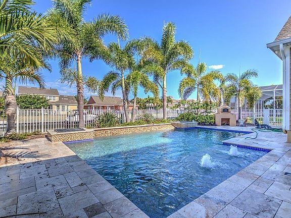 Updated! Upgraded! Gorgeous COASTAL POOL HOME in beautiful MiraBay! Private dock... Located on a saltwater canal with direct access to Tampa Bay! This is the largest one story floor plan offered in the entire neighborhood 3167 sq ft!! Featuring 4 bedrooms, 3 baths, office, and a separate dining room. EVERYTHING is UPGRADED! Some of the many Features include granite counter tops, 42 inch wood kitchen cabinets, stainless steel appliances, Travertine and plank tile floors throughout, crown moulding, custom ceiling beams, plantation shutters, wainscot wood trim work, a fireplace, NEWLY remodeled Master Bathroom, custom built master closet, brick pavers AND a reverse edge infinity POOL...with a wood fire burning PIZZA oven outside the pool area! AMAZING sunsets by the pool area with a direct western exposure. NEW SEAWALL! The owner has taken meticulous detail with the remodeling and created an upscale inviting coastal environment. This is a great opportunity to move in immediately and start enjoying this amazing home and the lifestyle MiraBay has to offer! Including access to your 10, 000 sq ft clubhouse, State of the art gym, cafe, Olympic size heated swimming pool, 136 ft waterslide, Beach volleyball, pickleball, tennis and basketball courts... just to mention a few of the wonderful amenities offered in MiraBay. Start living the DREAM! Home warranty is included.
