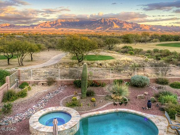 For the homeowner that values privacy, tranquility, and BEAUTIFUL OUTDOOR LIVING SPACES, there is no better choice than this gorgeous home in Canoa Ranch! Sitting high on a hill overlooking the Canoa Ranch golf course, this home offers spectacular, unobstructed Santa Rita Mountain VIEWS! An impressive stacked stone entry is a beautiful accent to the front of the home and the mountains towering behind the home are the perfect back drop. A large great room welcomes guests inside where they will be awed by the views surrounding the home. A stunning beehive fireplace anchors the room and adds warmth and ambience. An open kitchen is adjacent and a formal dining room is perfect for celebratory dinners. Step outside to the spectacular outdoor living space where friends and family will spend time and memories will be made! A sparkling pool is accented by a raised hot tub and those magnificent golf course and mountain views! A stacked stone fire pit glows with a glass bead pit as you gaze at the stars in the sky. Back inside, the master suite has its own views and a spa like bath offers a tiled walk in shower and soaking tub. The guest suite is situated perfectly to offer privacy for your guests. A large den is open to the great room and is large enough for a his and her office, or a murphy bed for guest overflow. If you are wanting a home that will inspire you with its stunning outdoor living space, a home that will allow you to live with ease and beauty, a home that embraces all that the desert has to offer, then you have found your perfect place!