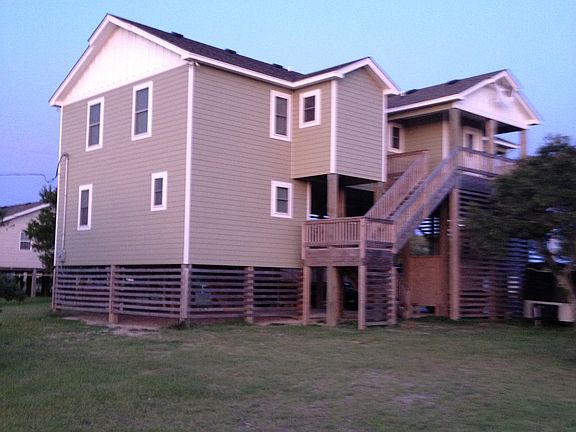 MUST SEE TURN KEY home on a big lot. Room to build a pool. 3 bedroom, 2 full baths upstairs. Downstairs apt. with bedroom, full bath and kitchen. Never been rented. Views of the water from front and back of the house. All appliances, 5 tvs, some furniture, bedding, linens and kitchenware transfer. Just bring your toothbrush. Move in ready! Downstairs apt. is above flood plain and no flood insurance is necessary. Our house is used as an example on flood maps! Approved by Dare County during construction for a 4 bedroom septic. Roomy outdoor shower, and fish cleaning table.Lots of beautiful sunsets. Quiet low traffic street but close to everything! Golf cart community. Can park your boat underneath the house.