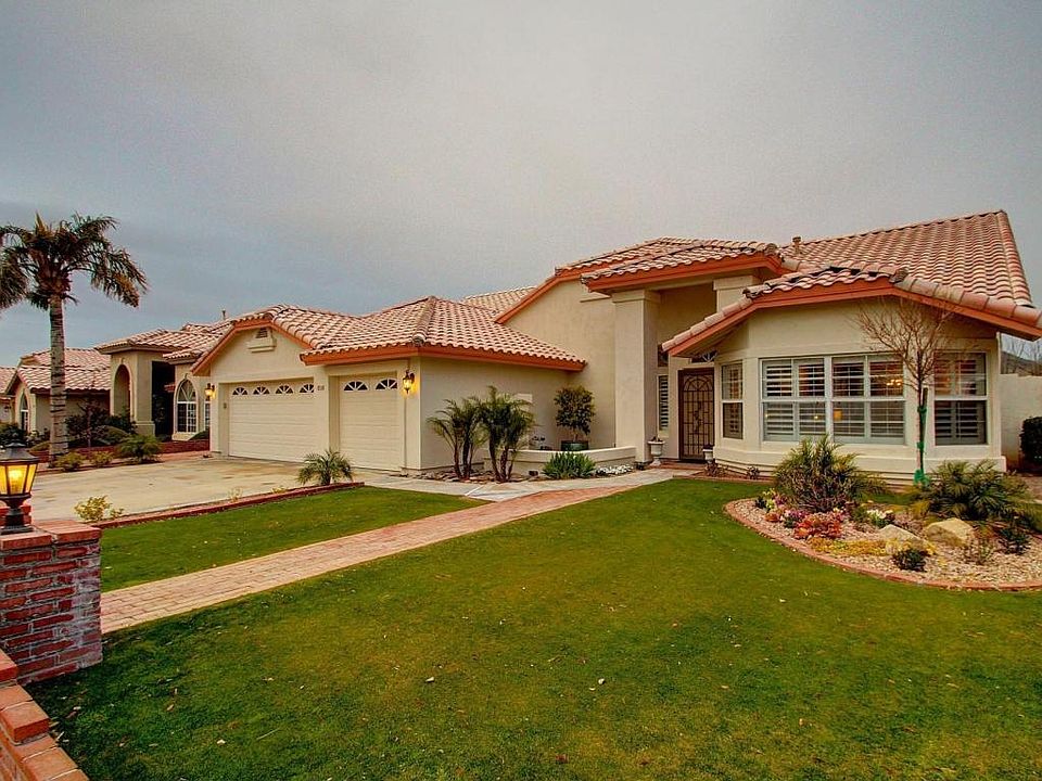 Hard to find single level with 4 bedrooms and a 3 car garage. New roof in 2014. Home shows light and bright throughout. Wood (faux) flooring throughout and neutral carpet in bedrooms with 6" baseboards. Updated light fixtures, new higher toilets and bathroom fixtures, new interior two-toned paint and exterior paint. Large master bedroom with huge master bath with vanity and double sinks. Gorgeous front and back yards with lush grass, mature trees and bushes. Large back patio with built in BBQ.