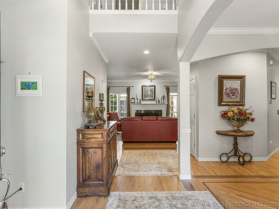 Located in the beautiful community of Preston Woods, this home sits at the end of a cul-de-sac surrounded by mature trees in Jenks SE School District. True 5 bedroom home! Grand entry opens to Formal Living Room & Dining Room. Great Room with a wall of windows & an abundance of natural light. Granite Kitchen with island, stainless steel appliances & nook. Secluded Primary Suite with new Luxe bath (2022), 2 walk-in closets. Handsome Office with built-ins. 2 fireplaces, powder bath. Huge Game Room Up + flex/exercise/media room. 4 additional Bedrooms Up with walk-in closets. Extensive hardwoods throughout + newer carpet in bedrooms. New roof (2019), covered pergola with oversized patio. Parklike yard with 8 ft privacy fence & sprinkler system. New paint outside (2023).