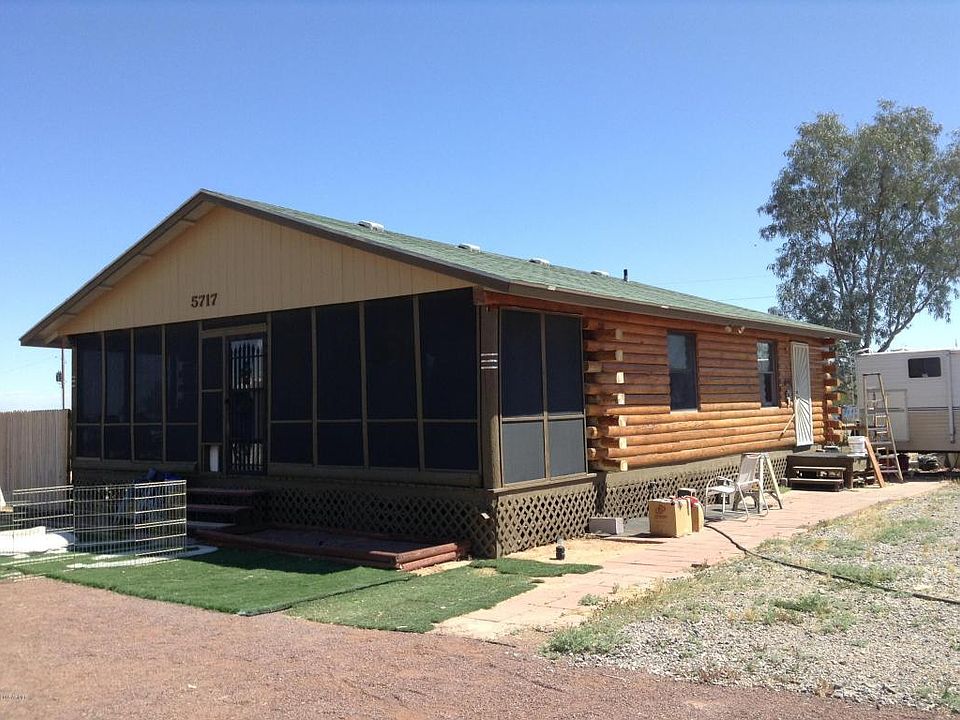 Your very own Log Home on 1.25 Acres, fenced with horse allowed. Cozy and Comfortable log home with title floors, remodeled bath, open kitchen and great room. screen porch for those gorgeous Arizona Sunsets. 5 storage sheds some need work. New HVAC, hot water heater, and stove in 2012. Room for RV's, horse trailers and much more. All appliances will stay with the home. Some material to build a deck (8x30) and logs to cover outside of one shed will stay for the new owner. Property is on San Carlos Electric and Arizona Water.Great Opportunity to have your own horse property close the Central Arizona College and I-10 interchange, Sams and the Mall.