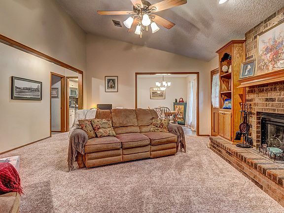 You will just LOVE this tidy, well-kept home! Upgraded with engineered hardwood floors by Pergo, you will appreciate their low maintenance. Stepping into the living room you will immediately notice the brick fireplace, lovely built-ins, vaulted living room ceiling, and soothing color palette. Good flow is key in comfort and entertaining, and this home flows wonderfully throughout the public spaces. A huge picture window in the dining room brings the outdoors inside, and the beautiful upgraded kitchen will have you cooking up a storm! Gorgeous granite countertops, upgraded cabinetry, stunning backsplash and stainless steel appliances outfit the space. The split bedroom floor plan is ideal, and it offers plenty of master suite privacy. The master features a great walk-in closet! There are updated ceiling fans and light fixtures throughout the home as well. You will love this oversized backyard, perfect for entertaining family and friends. OH SO CLOSE to Tinker too!