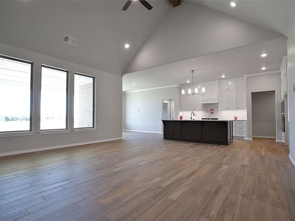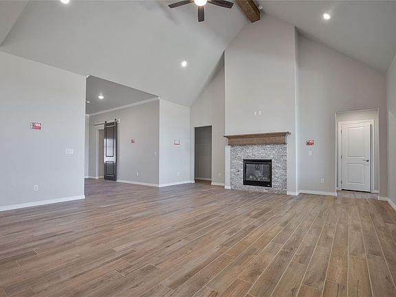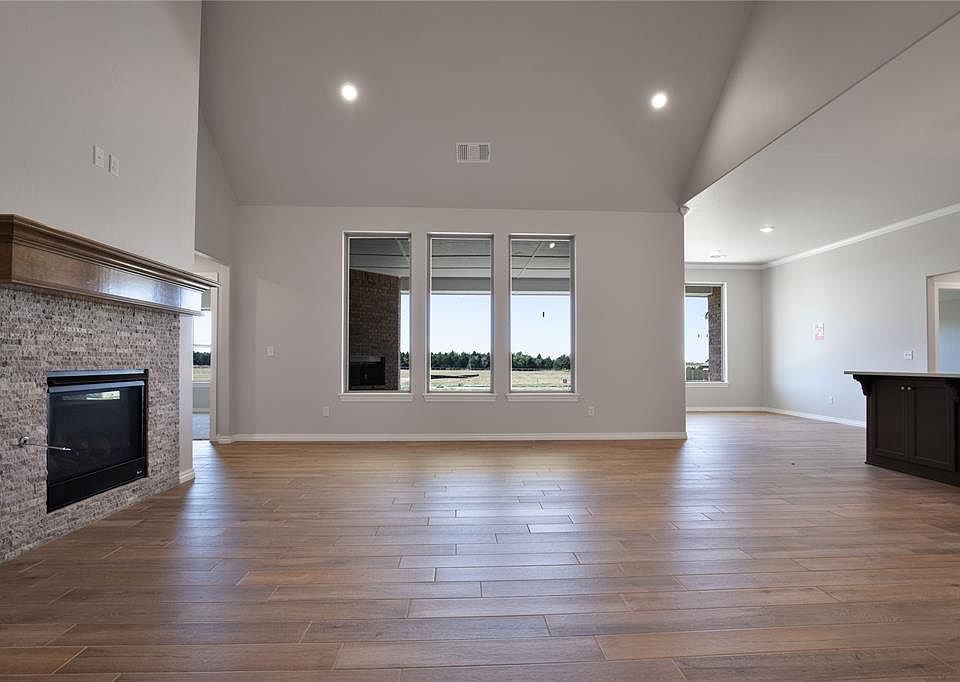 This Smith floor plan includes 3,515 Sq Ft of total living space, which includes 3,000 Sq Ft of indoor living space & 515 Sq Ft of outdoor living space. There is also a 640 Sq Ft, three-car garage with carriage doors and a storm shelter installed. This one-story luxurious home offers 5 bedrooms, 3 full bathrooms, 2 covered patios, a powder room, a large mudroom, & a utility room. The great room features a beautiful cathedral ceiling, a ceiling fan, 3 manicured windows, crown molding, a center stacked stone surround fireplace, & wood-look tile. The 5-star kitchen supports a large center island, stellar pendant lighting, 3 CM countertops, stainless steel appliances, well-crafted custom cabinets to the ceiling, USB plug-ins, & lovely tile backsplash. The prime suite includes a sloped ceiling detail, windows, our cozy carpet finish, & a ceiling fan. The spa-like prime bath is attached & holds separate vanities, a large walk-in shower, a Jetta Whirlpool tub, & a huge walk-in closet. Outdoor living has a corner wood-burning fireplace, a gas line, & a TV hookup. Other amenities include a tankless water heater, an air filtration system, a fresh air ventilation system, double glazed vinyl low E windows, R-44 insulation, & MORE!