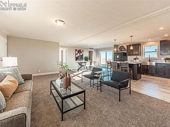 Quiet, County living with mountain views. Brand New 3 bedroom, 2 bath, Rancher, situated on 40 pristine acres with no restrictions, just 30 minutes from the city. Open floor plan offers an abundance of natural lighting throughout, sizable living room, separate dining area with glass sliding doors. Kitchen has a large center Island with seating, gas cooking, Stainless Steel Farm Sink, upgraded fixtures, and lots of cabinets for storage. Primary Suite is complete with two walk-in closets and en-suite with oversized shower, double vanities, and linen closet. Added features include walk-in closets in every bedroom, crown molding throughout the home adding a touch of elegance, laundry with washer/dryer and shelving, oversized, detached 24x30 2 car garage, and landscaping. Home comes with a 7-year warranty that includes Appliances, HVAC, Electrical, and Plumbing. If this home is not a perfect fit, there are seven additional lots available and many floor plans to choose from.